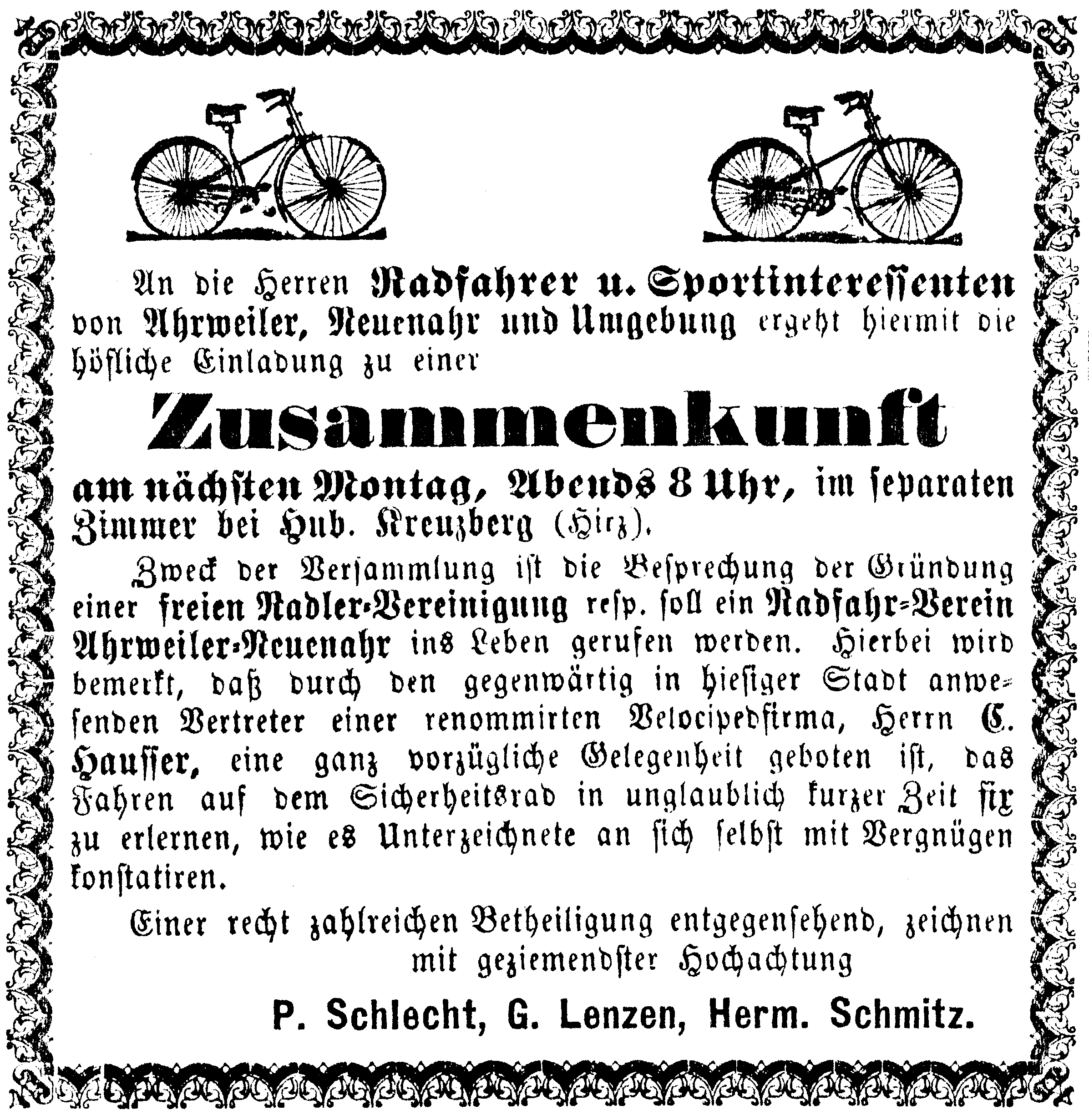 Nach einem Aufruf an die Herren Radfahrer und Sportinteressenten von Ahrweiler, Neuenahr und Umgebung zu einer Zusammenkunft im separaten Zimmer bei Hub. Kreuzberg (Ahrweiler, Hirz) im Mai 1890 meldeten sich augenscheinlich so viele Interessenten, dass ein Radfahr-Verein Ahrweiler-Neuenahr gegründet werden konnte. Die Gründungsväter P. Schlecht, G. Lenzen und Herm. Schmitz hatten vorher Gelegenheit, durch einen in Ahrweiler anwesenden Vertreter „einer renommirten Velocipedfirma das Fahren auf dem Sicherheitsrad in unglaublich kurzer Zeit fix zu erlernen“.