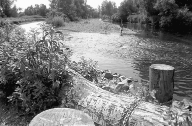 Eingeschlagene Holzpolder und befestigte Baumstämme dienen als Strömungslenker, damit die Ahr mäandriert und wieder einen natürlichen Flusslauf einnimmt.