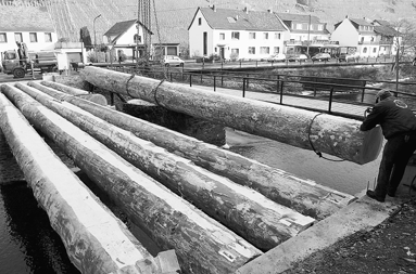 Mehr als 80 Zentimeter dick sind die Rundholzbalken an der neuen Ahrbrücke.