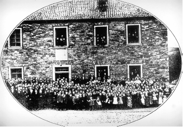 Die alte Volksschule zu Wadenheim: Das Foto wurde anlässlich des 25jährigen Dienstjubiläums von Lehrer Weller im Jahre 1865 aufgenommen. Das 1786 erbaute Gebäude wurde 1895 abgerissen. An dieser Stelle steht heute das „Alte Rathaus“ in der Hauptstraße von Bad Neuenahr.