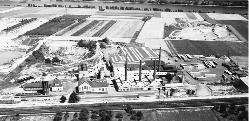 Luftaufnahme der Glasfabrik in der Goldenen Meile, um 1960
