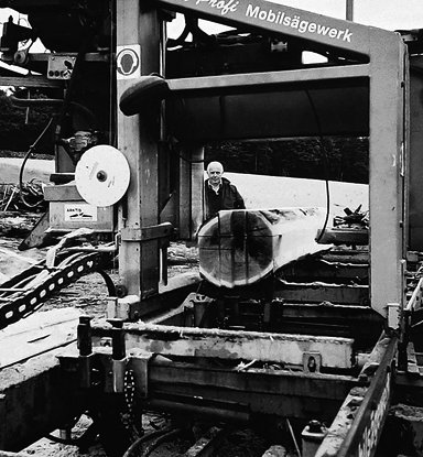Der Eichenstamm wird durch ein Mobilsägewerk vor Ort bearbeitet.